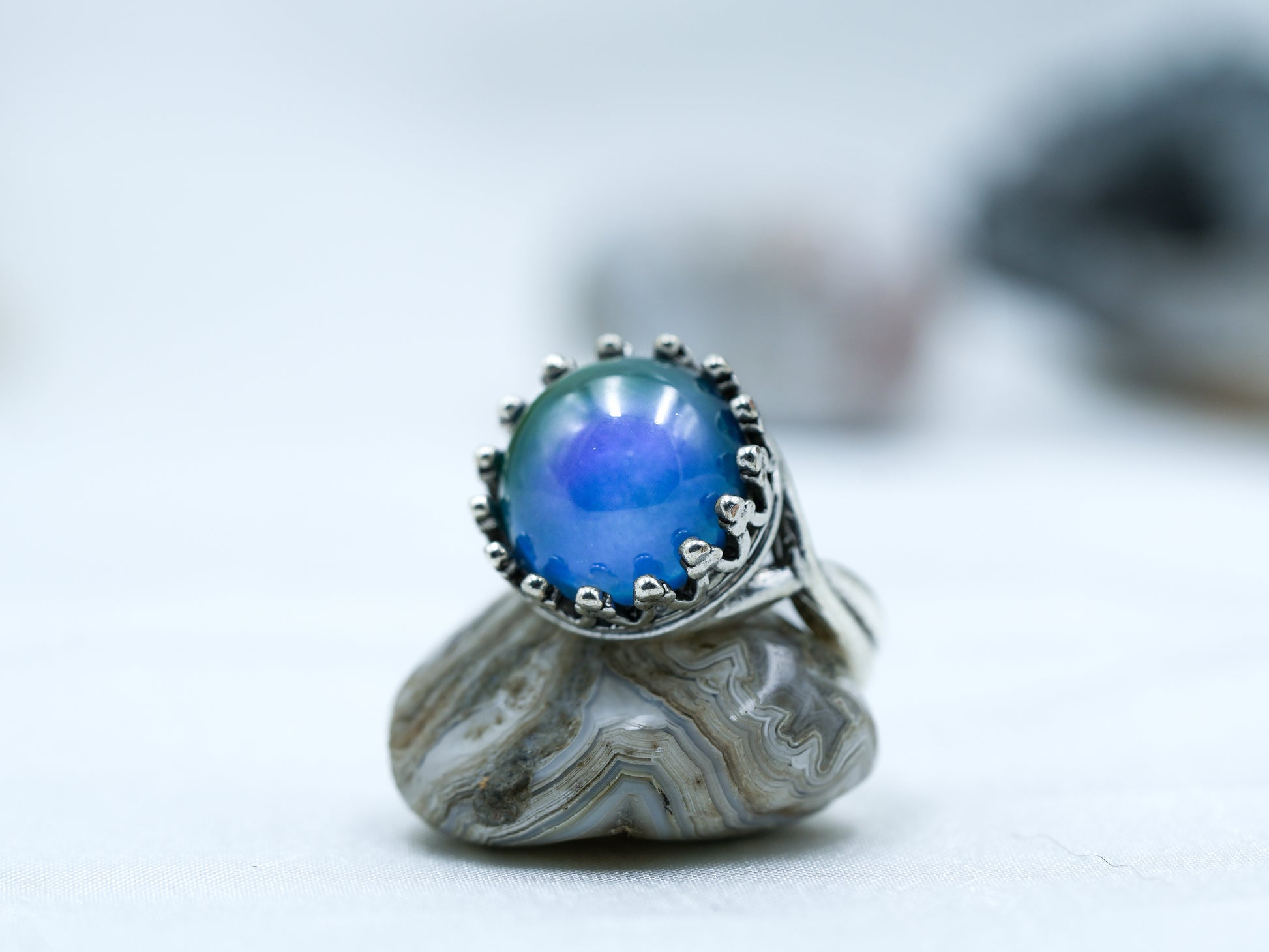 A vintage-inspired captured mood ring featuring a luminous stone that shifts colours with your body temperature.